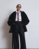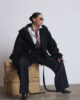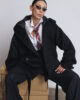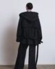 Вкорчене оversize пальто чорного кольору виконане з вовни із додаванням кашеміру. Модель з боковими кишенями, кокеткою та глибоким капюшоном. Двобортне, застібається на ґудзики та фіксується поясом, що іде в комплекті. Рукава доповнені ремінцями.