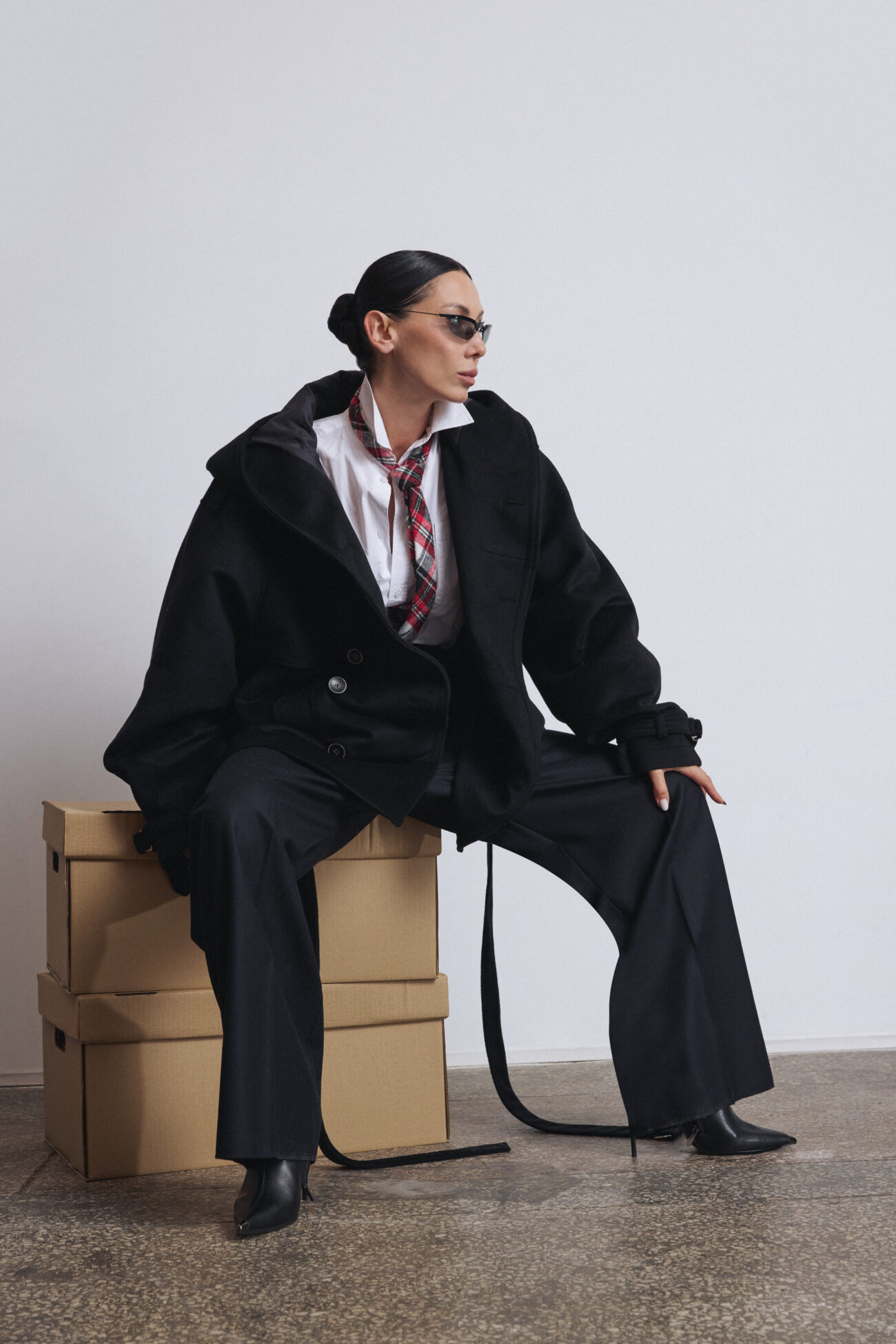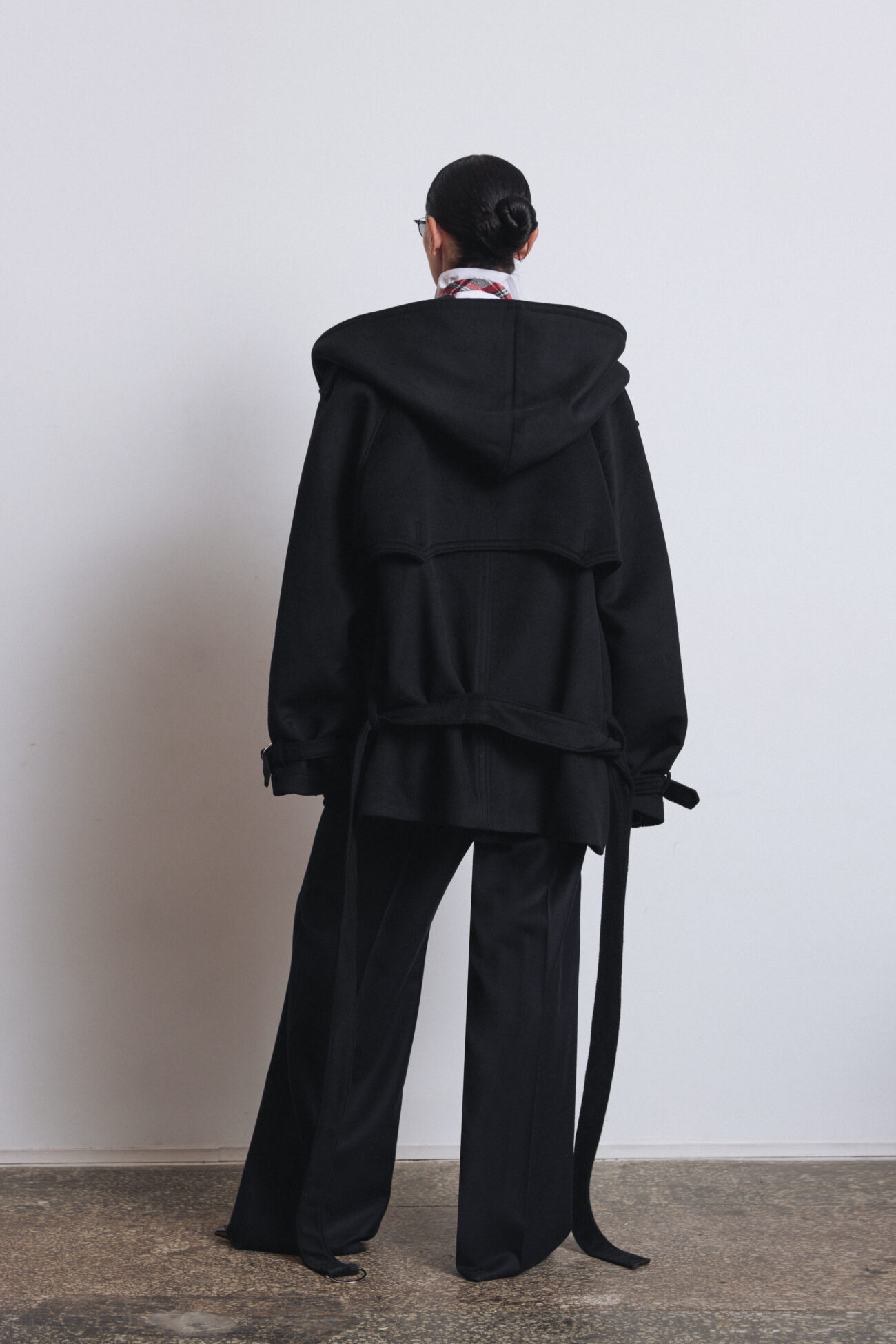 Вкорчене оversize пальто чорного кольору виконане з вовни із додаванням кашеміру. Модель з боковими кишенями, кокеткою та глибоким капюшоном. Двобортне, застібається на ґудзики та фіксується поясом, що іде в комплекті. Рукава доповнені ремінцями.