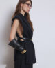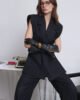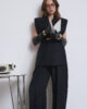 Подовжений жилет виконаний з вовняної костюмної тканини чорного кольору. Модель виробу без рукавів, з підплічниками, які надають маскулінності. Виріб з коміром піджачного типу, нагрудними виточками, нагрудною кишенею та прорізними кишенями в рамку, позаду – шлиця. На підкладці. Застібається на приховану кнопку. Жилет оздоблений хомутиками для фіксації ременя на талії. Шкіряний тонкий ремінь в комплекті.